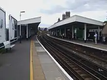 Staines railway station is a conventional (double-track) railway, immediately east of the junction of the Windsor and Reading lines, having converged. It has two flanking platforms, with the main station entrance and buildings on the northern platform 1, and a secondary entrance and buildings on the southern platform 2.