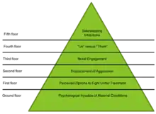 The staircase model is a psychological explanation as to why out of large numbers of disgruntled people in society, only a very small minority end up committing acts of terrorism. It was proposed in 2005 by Fathali M. Moghaddam in his paper "The Staircase to Terrorism".[1] The model involves a metaphorical staircase, where each step is influenced by a specific psychological process. It is proposed that the higher an individual moves up the staircase, the fewer alternatives to violence they will see, ultimately resulting in the destruction of themselves, others, or both.[2]