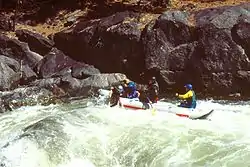 The New Melones project is well known for a legal battle between environmentalists, the state of California and the federal government which began in the 1970s as recreational whitewater rafting exploded in popularity.[99] The Stanislaus was for a time the most popular run in the western United States, and was valued for the spectacular scenery along its rugged limestone canyons.[100] Friends of the River was formed to push a statewide ballot measure, Prop 17, that would have designated the Stanislaus as a National Wild and Scenic River and forestalled the construction of New Melones. Prop 17 was defeated by a narrow margin of voters, in part due to heavy lobbying by water agencies.[101] Afterwards, dam opponents focused on limiting the level of the new reservoir, even as dam construction was completed in 1978. In May 1979 environmental activist Mark Dubois chained himself to a boulder in the Stanislaus Canyon, forcing federal authorities to either stop filling the lake or drown him.[102][103]