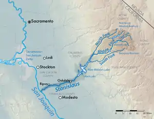 The Stanislaus River is a tributary of the San Joaquin River in north-central California in the United States. The main stem of the river is 96 miles (154 km) long, and measured to its furthest headwaters it is about 150 miles (240 km) long. Originating as three forks in the high Sierra Nevada, the river flows generally southwest through the agricultural San Joaquin Valley to join the San Joaquin south of Manteca, draining parts of five California counties. The Stanislaus is known for its swift rapids and scenic canyons in the upper reaches, and is heavily used for irrigation, hydroelectricity and domestic water supply.