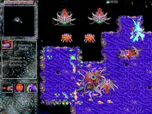StarCraft's first expansion, Insurrection, was released for Windows on July 31, 1998.[53] The expansion was developed by Aztech New Media and authorized by Blizzard Entertainment.[54] Its story focused on a separate Confederate colony alluded to in the manual to StarCraft, following a group of Terran colonists and a Protoss fleet in their fight against the Zerg and a rising local insurgency. Insurrection was not received well, being criticized by reviewers for lacking the quality of the original game.[55] Insurrection was followed within a few months by a second expansion, Retribution. Developed by Stardock, published by WizardWorks and authorized by Blizzard Entertainment,[54] Retribution follows all three races attempting to seize control of a powerful crystal on a Terran Dominion colony. The expansion was not received with critical support, instead being regarded as average but at least challenging.[56] After the release of Retribution, Blizzard Entertainment announced a new official expansion pack that would continue on the story of StarCraft. StarCraft: Brood War was consequently created, developed jointly by Blizzard Entertainment and Saffire. Brood War continues the story of StarCraft from days after its conclusion, and was released for both Windows and Mac to critical praise[57][58] on December 18, 1998, in the US and in March 1999 in Europe.[59]