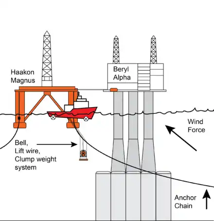 Prior to the accident, the wind-speed indicator was fluctuating between 15–20 knots (28–37 km/h). Standing alongside the Beryl platform, near where the Canopus would be commencing work, was the Haakon Magnus, a Norwegian semi-submersible, with her massive anchor chains extended. Kelly determined the weather was suitable for diving and, at 0240, he launched the bell with Tony Prangley and Michael Ward inside.[14]