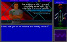 Once Reiche and Ford imagined the different alien personalities, Reiche hand-drew a flow chart for each alien's dialog options, which Ford would implement into the game with placeholder tags.[22] However, the sheer quantity of writing and art proved to be challenging for the game's epic scale.[16] Fred Ford surprised the team with his prolific coding, and it was the rest of the team who needed to catch-up with art, writing, music, and other assets.[14] They quickly enlisted the help of friends and family to create game content.[16] One crucial friend was Starflight creator Greg Johnson, who Reiche had previously helped on Starflight while sharing office space.[14] Johnson ended up writing dialog for several aliens, as well as creating most of the artwork for the alien spaceships.[23] They were also able to hire fantasy artist George Barr through mutual friends,[24][25] who had inspired the game's "pulp science-fiction" feel, and happened to be living nearby.[14] Long-time friend Erol Otus was another collaborator, who Reiche describes as contributing the widest range of content, including music, text, art, illustrations for the game manual, and (later) voice-acting.[14]