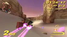 Star Wars: Super Bombad Racing is a kart racing game. Players select one of various Star Wars: Episode I – The Phantom Menace characters to compete on various courses patterned after the film. Each course also features a reversed, mirrored variant. Boba Fett and Darth Vader appear as unlockable guest characters. Races are conducted with eight competitors and consist of three laps. Powerups are littered throughout each course, and each provides the player character with varying temporary attributes, such as a boost in speed, a shield, or offensive weaponry.[1] Up to four players can join in splitscreen play using the PlayStation 2 multitap peripheral.[2]