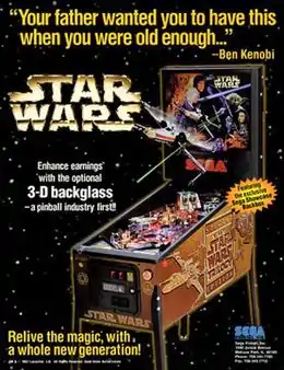 Star Wars Trilogy is a 1997 pinball machine released by Sega Pinball. It is based in the Star Wars original trilogy. It was released in the year of the release of the special editions of the films. The backbox features an optional lenticular lens 3D image as a pinball industry first.[1]