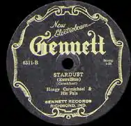 After working out the details with the band, Carmichael booked a recording session with Gennett Records for October 31, 1927.[9] Since he had not written any sheet music for the song, he had to whistle the tune to the musicians.[15] Carmichael played the piano, backed by Emil Seidel and his orchestra: Byron Smart (trumpet), Oscar Rossberg (trombone), Dick Kent and Gene Wood (alto saxophones), Maurice Bennett (tenor saxophone), Don Kimmel (guitar), Paul Brown (tuba), Cliff Williams (drums).[16] The session took place at Gennett's studio in Richmond, Indiana. The recording featured a "medium fast and jazzy tempo" with no lyrics. Under the single-word title "Stardust," it was placed on the flipside of "One Night In Havana", assigned the release number 6311, and credited to Hoagy Carmichael and His Pals.[13]