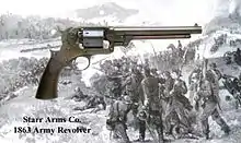 A Starr revolver (Starr DA) is a double-action revolver which was used in the western theater of the American Civil War until the U.S. Ordnance Department persuaded the Starr Arms Co. to create a single-action variant after discontinuation of the Colt. The company eventually complied, and the Union acquired 25,000 of the single-action revolvers for $12 each (equivalent to $264 in 2021). However, the price paid by the government for the DA army revolver was $25.[4] The State of Ohio purchased 500 of the .36 Caliber Navy version for $20 each.[5]