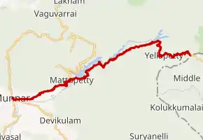 Munnar (starts from km 113/6 of Aluva - Munnar road) - Madypatty dam - Indo Swiss Project Gate - Top Station - State boundary - Road continues to Tamil Nadu as part of Kodaikanal–Munnar Road
