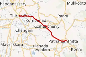 SCS junction, Thiruvalla - Manjadi - Meenthalakara - Kattode - Thottabagom - Vallamkulam Bridge - Nellad - Eraviperoor junction - Kumbanad Pullad (Kottayam - Kozhencherry Highway -SH09- joins - Chettimukku - Nedumbrayar - Maramon - Kozhencherry - Thekkemala junction - Nellikala - Elanthur - Pathanamthitta - Kumbazha junction (joins Main Eastern Highway / SH08)[1]