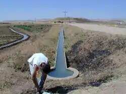 Turkey has a total of 280,000 square kilometres of agricultural area, of which 85,000 km² is economically irrigable and 49,000 km² is currently being irrigated.[6] As of 2005, an area of 28,000 km² is equipped with facilities of State Hydraulic Works's irrigation projects, making 10% of the total agricultural area and 57% of the irrigated area in Turkey.[7]