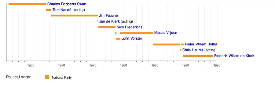 The office was abolished in 1994, with the end of Apartheid and the transition to democratic majority rule. Since then, the head of state and head of government is known simply as the President of South Africa.