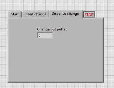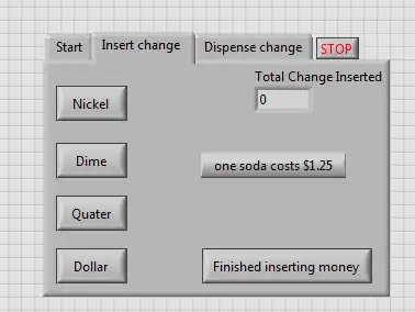 The "Insert money case" also changes which tab is being displayed to the "Insert change" tab on the block diagram. Here the user can insert money and also see how much money was through the "Total Change Inserted" display.