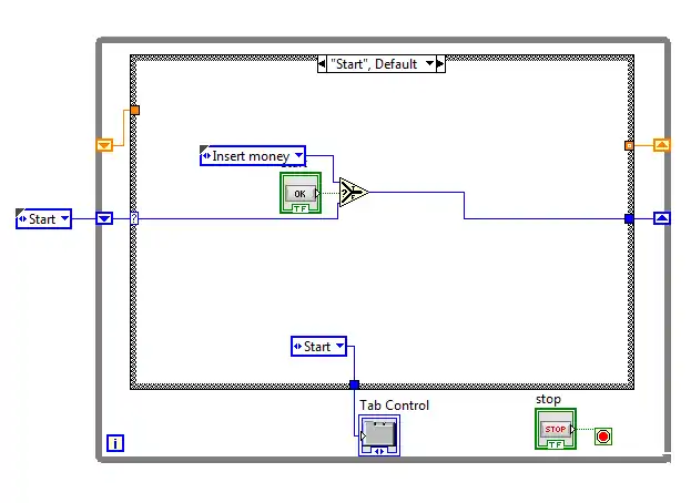 This case holds the user on the start menu on the block diagram, shown below, until the user hits the start button. Once the start button is pressed, the program is then sent to the next case (called the "Insert money" case).