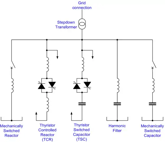 Typically, an SVC comprises one or more banks of fixed or switched shunt capacitors or reactors, of which at least one bank is switched by thyristors. Elements which may be used to make an SVC typically include: