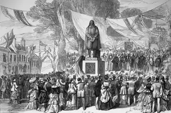 The unveiling was a major event, called the Bunyan Celebration (or the Bunyan Festival), attended by people from across the United Kingdom, from the then colonies and from America.[6] The day was treated as a holiday by all the nearby villages and Bunyan's birthplace, Elstow.[7] Locally invitations went to all Sunday Schools, totalling 3,380 children who consumed a ton and a quarter of cake.[8]