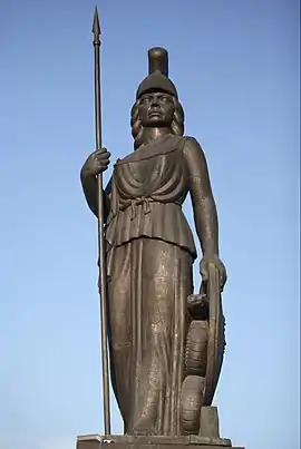 It is a bronze sculpture created by Joaquín Arias and Pedro Medina Guzmán, who cast it in Aguascalientes,[2] and the architect was Julio de la Peña.[4] Minerva features a Late Roman ridge helmet and a goatskin aegis covers her breast. She holds a spear with her right hand and a shield with the left one.[2] Her face has indigenous facial features as Arias modified the project, which originally requested a Greek figure.[1] Arias modelled the statue on notable women of Jalisco that he had photographed.[3] There is a rumor that says that Arias based on the face of Yáñez's wife.[1]