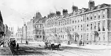 When Queen Anne's Gate was built by the banker William Paterson in 1704–05,[6] it originally formed two separate closes divided by a wall with two openings, with Queen Square to the west and Park Street to the east. The statue is first mentioned in Edward Hatton's A New View of London (1708) as being "erected in full proportion on a pedestal at the E.End of Q[ueen]. Square, Westminster".[5] An engraved map of 1710 depicts the statue of Queen Anne in the middle of the wall, flanked by the gateways on either side.[4] At some point in the early 19th century the statue was moved to a new position in the square. The Gentleman's Magazine reported in 1814 that "the statue until of late occupied a conspicuous situation on the East end of the square, but now we find it huddled up in a corner".[5]