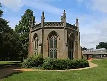 The temple was a memorial commissioned by George Staunton in 1824 with a large memorial urn at its centre.[21] As initially completed the temple contained dedications to Staunton's parents and further dedications to more distant relations and friends.[21] In the following years an eight busts were added in a semi circle around the urn.[22] Most of the busts were of friends of Staunton who had died after 1820 but one was of the then still living William Howley.[22] In 1840 Staunton decided to add no further memorials to the temple.[23] Further busts were added after this time but they were primarily of people still living.[24] The temple was removed when William Henry Stone had his new home constructed on its site.[25]