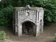The Shell house was built in 1828 and is covered in shells from Hayling Island. [26] The house is hexagonal in shape and was based on the design of the Chichester Cross.[1] By 1836 George Staunton was using the shell house as a museum of curiosities for such items as a stuffed crocodile and examples of Roman pottery.[27] This structure has permanent barricades erected in the arches to prevent entry. It is a Grade II* listed building[28]