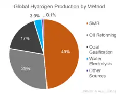 Globally, almost 50% of hydrogen is produced via steam reforming.[8] It is currently the least expensive method for hydrogen production available in terms of its capital cost.[15]