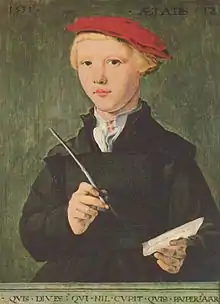 The first rector recorded is Meester Gheraerde de scoelmeester in 1301.[3] In 1389 the city was given the privilege of appointing the rector together with the pastor of the Bavo.[3] The rector was paid by the fees paid by students. He also took in students from outside the city and received extra fees for room and board. From his income, he paid the teachers (ondermeesters) himself.[3] The basis for education was the artes liberales, whereby parts of the Trivium were given in Latin and the Quadrivium included music, since the choir boys needed to sing in church.[3] For boys studying theology, Hebrew lessons were given in addition to Latin (Greek only became available from 1522).[3] Students wanting to continue their studies, needed to leave the country before the Leiden University was founded in 1579. According to the archives of the Heilige Geest, a religious institution formerly located at what is now the Hofje van Oorschot, they had a fund from 1502 to 1577 (the Satisfactie) for sending good students to Cologne to further their studies there.[3] In 1553, when the school had been run by Junius, they even petitioned Charles V, Holy Roman Emperor for the right to found a university in Haarlem, but this was never answered.[3] After the Satisfactie van Haarlem in 1577, the books of all the monasteries and cloisters in Haarlem were given to the Latin school and the rector Cornelis Schonaeus (1540–1611) took two weeks to draw up the inventory list.[3] This same Schonaeus was the one who was in charge of moving the school from the schoolsteeg to the current location in 1583.[4] He almost lost his job when the council decided to start a collegie or university there, but perhaps because Leiden had already been founded, this never happened. He did complete a major reorganization of the school that was then placed in the hands of his successor, Theodorus Schrevelius.[4]