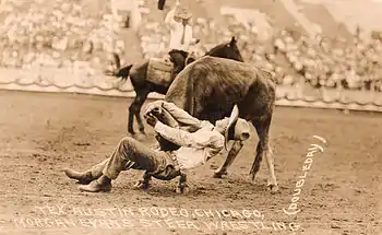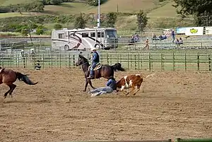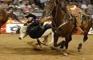 Steer wrestling, also known as bulldogging, is a rodeo event in which a horse-mounted rider chases a steer, drops from the horse to the steer, then wrestles the steer to the ground by grabbing its horns and pulling it off-balance so that it falls to the ground. The event carries a high risk of injury to the cowboy. There are some concerns from the animal rights community that the competition may include practices that constitute cruelty to animals, but the injury rate to animals is less than five-hundredths of one percent.[1] A later PRCA survey of 60,971 animal performances at 198 rodeo performances and 73 sections of "slack" indicated 27 animals were injured, again approximately five-hundredths of 1 percent – 0.0004.[2]
