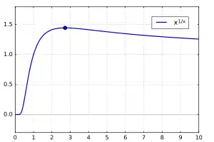 The maximum is at , where e denotes the base of the natural logarithm. One can determine that by solving the equivalent problem of maximizing