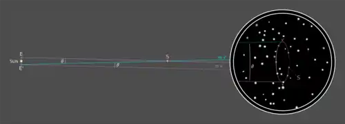 The plane of Earth’s orbit is at an angle to a line from the Sun through S. The vertices v and v' of the elliptical projection of the path of S are projections of positions of Earth E and E’ such that a line E-E’ intersects the line Sun-S at a right angle; the triangle created by points E, E’ and S is an isosceles triangle with the line Sun-S as its symmetry axis.