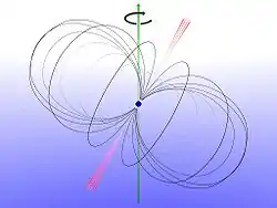 The component of the radial velocity observed through line broadening depends on the inclination of the star's pole to the line of sight. The derived value is given as , where is the rotational velocity at the equator and is the inclination. However, is not always known, so the result gives a minimum value for the star's rotational velocity. That is, if is not a right angle, then the actual velocity is greater than .[2] This is sometimes referred to as the projected rotational velocity. In fast rotating stars polarimetry offers a method of recovering the actual velocity rather than just the rotational velocity; this technique has so far been applied only to Regulus.[3]