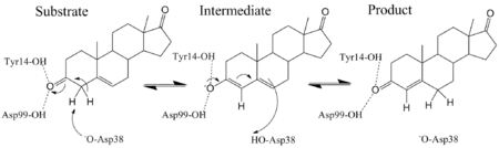 KSI catalyzes the rearrangement of a carbon-carbon double bond in ketosteroids through an enolate intermediate at a diffusion-limited rate.[2] There have been conflicting results on the ionization state of the intermediate, whether it exists as the enolate[12] or enol.[13] Pollack uses a thermodynamic argument to suggest the intermediate exists as the enolate.[2] The general base Asp-38 abstracts a proton from position 4 (alpha to the carbonyl, next to the double bond) of the steroid ring to form an enolate (the rate-limiting step)[14] that is stabilized by the hydrogen bond donating Tyr-14 and Asp-99.[2] Tyr-14 and Asp-99 are positioned deep within the hydrophobic active site and form a so-called oxanion hole.[15] Protonated Asp-38 then transfers its proton to position 6 of the steroid ring to complete the reaction.[2]