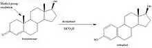 Steroidal aromatase inhibitors are a class of drugs that are mostly used for treating breast cancer in postmenopausal women. High levels of estrogen in breast tissue increases the risk of developing breast cancer and the enzyme aromatase is considered to be a good therapeutic target when treating breast cancer due to it being involved in the final step of estrogen biosynthetic pathway and also its inhibition will not affect production of other steroids. Aromatase Inhibitors are classified into two categories based on their structure, nonsteroidal and steroidal; the latter resemble the structure of androstenedione.[1] Steroidal aromatase inhibitors irreversibly inhibit the enzyme by binding covalently to the binding site of aromatase so the substrate cannot access it.[2]