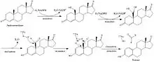 The synthesis of steroidal aromatase inhibitors is done with various methods, they all have in common that they are synthesized from a starting point that is the base structure of steroids. With various methods there a various starting point of synthesis, f.e testosterone, androstenedione and other variations of these compounds. The synthesis of Formestane from testosterone is a facile three step synthesis, as shown in figure 2. The synthesis has an overall 23% yield of Formestane. The first step is an oxidation of testosterone with Jones reagent to afford androst-4-ene-3,17-dione with a 73% yield. Step 2 is hydroxylation of androst-4-ene-3,17-dione with OsO4 followed by step 3 with alkaline dehydration of the resultant diols to give formestane.[16]