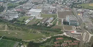 ![]() The above ground access to Stettbach station, with tram terminus in background | ||||||||||||||||||||||||||