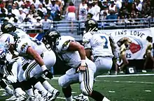 At the end of the 1994 season, Ryan and Beuerlein's contentious relationship would come to an end when Ryan exposed him to the 1995 NFL Expansion Draft.[33] The Jacksonville Jaguars took him with the number one selection.[34] Beuerlein was the starting quarterback for the first game in team history, starting the first two games before spraining his right MCL in a game against the Cincinnati Bengals.[35] When he was healthy two weeks later, backup Mark Brunell would keep the starting job, and Beuerlein would not see action again until Week 12 against the Tampa Bay Buccaneers. He came off the bench for an injured Brunell in the fourth quarter and led a team-record 96-yard touchdown drive, throwing what was potentially the game-tying touchdown, until head coach Tom Coughlin decided to go for a two-point conversion and the win, which failed and the Jaguars lost 17–16.[35] Beuerlein started the next four games in relief of Brunell – all losses – until Brunell returned and the Jaguars finished their inaugural season with a 4–12 record. Beuerlein reportedly had a confrontational relationship with head coach Coughlin, and finished the season as the third quarterback behind rookie Rob Johnson.[36] As he was in the last year of his original three-year deal with the Cardinals, after the season he became a free agent.