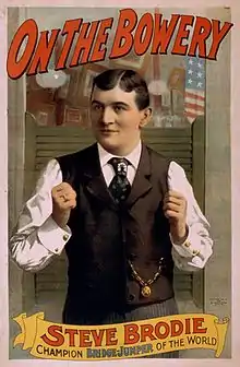 Brodie became a popular symbol of the Bowery and appeared personally in musical shows, and his character was used many times in film depictions of old New York. He starred in a three-act play titled On the Bowery by Robert Neilson Stephens, which opened in 1894. A facsimile of Brodie's saloon was the setting for the second act, and Brodie sang a song, "My Poil is a Bowery Goil". Valerie Bergere played Blanche Livingstone, the girl he rescues and then falls in love with. The play culminated with Brodie jumping off the bridge.[16][17]