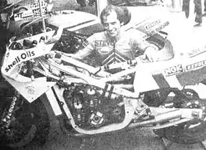 ![]() Henshaw in September 1982 with his then-new Spondon-framed bike debuted at Mallory Park having fairing-lowers removed to show the square-section aluminium frame, Suzuki RG500 engine and braced swinging-arm[1] | |||||||
