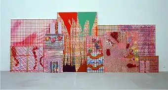 Critics characterize his painting of this time as challenging and sometimes confrontational in its mix of visual acumen, dissonant styles, and aggressive gesture and color.[23][29][30] He coupled chaotic, fluorescent stripe paintings that were likened to the work of Ed Moses with others in which he applied wads of artificial flowers; the results left reviewers to debate the intentions of work that sometimes convincingly riffed on art-historical abstraction and other times consciously pushed the limits of such precedents.[29] Christopher Knight described this work as "big, jarring field-painting" in which plastic flowers emerged from "the synthetic clash between loosely painted plaids and oozing puddles of toxic-looking color."[23]
