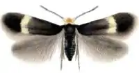 The wingspan is 4–6 mm. The head is ferruginous-orange, collar light yellowish. Antennal eyecaps ochreous-whitish. Forewings rather dark fuscous, slightly tinged with bronze or purple ; a shining whitish fascia beyond middle ; apical area beyond this more purple-tinged. Hindwings grey. [1] Adults are on wing from July to October.