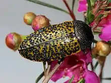 Stigmodera macularia have yellow elytra with a deeply pitted surface. The puncturations are colored in black and the pronotum is dark.