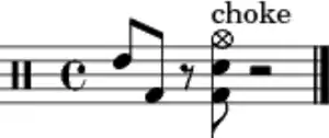 Common stings may feature a short roll followed by a crash or splash cymbal and kick drum, a flam, or a rimshot. The notation shown here is an advanced example that uses a tom then kick, followed by a pause to put the final stroke offbeat, and a final stroke using both the snare and kick drums to support a one-handed cymbal choke, meaning all three are hit at once.