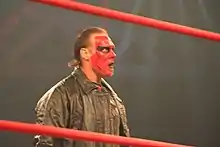 Over the next few weeks, Sting displayed a more maniacal character similar in look and style to Heath Ledger's portrayal of the Joker from the 2008 film The Dark Knight.[93][94] On the July 14 edition of Impact Wrestling, Sting, now dubbed as the "Insane Icon", regained the TNA World Heavyweight Championship from Mr. Anderson, after Fortune and Kurt Angle, disguised as his clown minions, attacked each member of Immortal, preventing them from interfering in the match.[95][96] He would go on to lose the title to Kurt Angle on August 7 at Hardcore Justice, after Angle hit him with a chair brought to the ring by Hulk Hogan.[97] Sting continued tormenting head members of Immortal with his strange new personality, and on the August 18 edition of Impact Wrestling, his longtime rival Ric Flair made his return to TNA and challenged him to a match. Sting agreed to put his career on the line in the match in exchange for Flair promising to deliver him his long-awaited match with Hogan, should he be able to defeat him.[98] On the September 1 edition of Impact Wrestling, Sting received a rematch against Angle for the TNA World Heavyweight Championship, but was defeated following interference from special enforcer Hulk Hogan and the rest of Immortal.[99] On September 11 at No Surrender, Hogan once again cost Sting the TNA World Heavyweight Championship in a three-way match, which also included Mr. Anderson.[100] On the September 15 edition of Impact Wrestling, Sting defeated longtime rival Ric Flair to earn the right to face Hogan at Bound for Glory.[101][102] On the October 6 edition of Impact Wrestling, after being exposed for his false claim of retiring and his secret ridicule of the fans, a furious Hogan impulsively agreed to hand TNA back to Dixie Carter, should Sting manage to defeat him at Bound for Glory.[103] On October 16 at Bound for Glory, Sting defeated Hogan to bring Dixie Carter back to power. After the match, Hogan turned on Immortal and helped Sting overcome the odds in his battle with the stable.[104] On the following edition of Impact Wrestling, Carter placed Sting in charge of the program.[105] Sting returned to the ring on the December 22 and February 9, 2012, editions of Impact Wrestling, where he teamed up with Jeff Hardy to defeat TNA World Heavyweight Champion Bobby Roode and Bully Ray both times.[106][107]