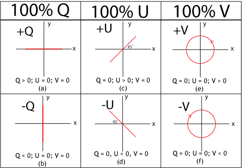 where is the total intensity, is the intensity of circular polarization, and is the intensity of linear polarization. The total intensity of polarization is , and the orientation and sense of rotation are given by