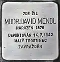 David Mendl was born on 30 September 1876 in Kolín. He studied medicine, became a physician and married Berta. The last residence of the couple before deportation was in Kolín. On 13 June 1942, MUDr. David Mendl and his wife were arrested and deported to Theresienstadt concentration camp by transport AAd. His transport number was 130 of 736. One months later, on 14 July 1942, the couple were deported to Maly Trostenets extermination camp by transport AAx. His transport number was 130 of 1,000. They lost their lives there.[48][49] |
