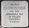 HERE LIVED IDA PREMSLEROVÁ BORN 1889 DEPORTED 1942 TO THERESIENSTADT MURDERED IN RAASIKU |