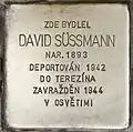 HERE LIVED DAVID SÜSSMANN BORN 1893 DEPORTED 1942 TO THERESIENSTADT MURDERED 1944 IN AUSCHWITZ |
