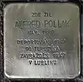 HERE LIVED ALFRED POLLAK BORN 1887 DEPORTED 1942 TO THERESIENSTADT MURDERED 1942 IN LUBLIN |