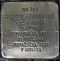 HERE LIVED HELENA POLLAKOVÁ NÉE MANDLOVÁ BORN 1897 DEPORTED 1942 TO THERESIENSTADT MURDERED 1942 IN LUBLIN |