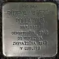 HERE LIVED RŮŽENA NADĚŽDA POLLAKOVÁ BORN 1935 DEPORTED 1942 TO THERESIENSTADT MURDERED 1942 IN LUBLIN |