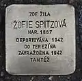 HERE LIVED ŽOFIE SPITZOVÁ BORN 1867 DEPORTED 1942 TO THERESIENSTADT MURDERED 1942 IBIDEM |