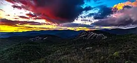 Stone Mountain is the centerpiece of Stone Mountain State Park. It is a dome of exposed granite (specifically a quartz diorite to granodiorite) of Devonian age, which has intruded into the gneiss of the Precambrian Alligator Back Formation.[1] It rises sharply over 600 feet (183 m) above the surrounding terrain. The mountain, which has an elevation of 2,305 feet (706 m) above sea level, is known for its barren sides and distinctive brown-gray color, and can be seen for miles. The mountain offers some of the best rock climbing in North Carolina, and the park's creeks and streams feature excellent brook trout fishing.
